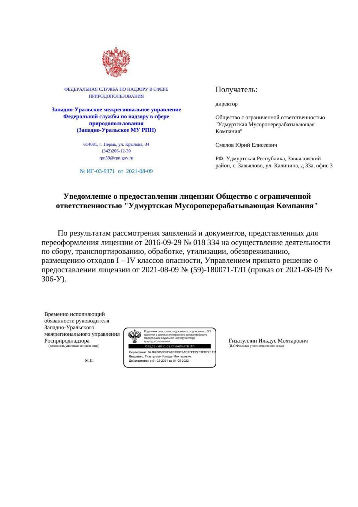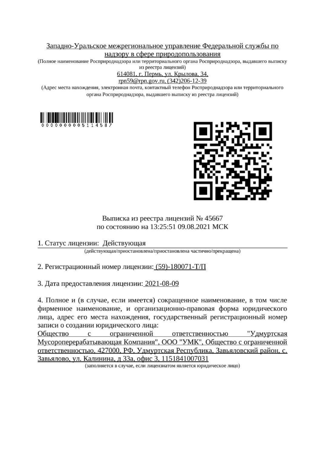 ООО «Удмуртская Мусороперерабатывающая Компания» имеет Лицензию на осуществление деятельности по сбору, транспортированию, обработке, утилизации, обезвреживанию, размещению отходов III-IV классов опасности (Лицензия № (59) - 180071 - Т/П от 09.08.2021 года, выдана Федеральной службой по надзору в сфере природопользования).